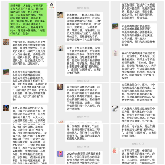 会上,全体党员积极分享自己的观后感,不仅致敬了医务工作者,还探讨了学生党员的青年使命。疫情的逆行者们,在国家和人民需要他们的时候,舍小家,为大家,挺身而出,这是我们致敬以及学习的榜样。作为祖国的青年一代,应该有担当精神,背负时代责任,不忘初心,砥砺前行。