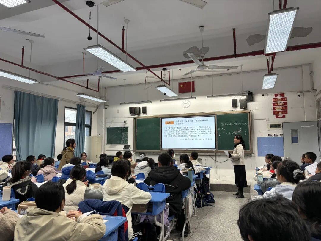 在初中部,陈惠群老师带来了《隋唐时期的中外文化交流》一课。陈老师以“中华行者”和“异域来客”两个视角,带领学生结合地图研读史料,在明确隋唐中外文化交流时空位置的基础上,分析鉴真东渡、玄奘西行的历程和贡献,既展现了中华文明的开放性、包容性、创新性和互鉴性的特点,又增强了学生的文化自信,培养其主动参与中外文明交流的意识。