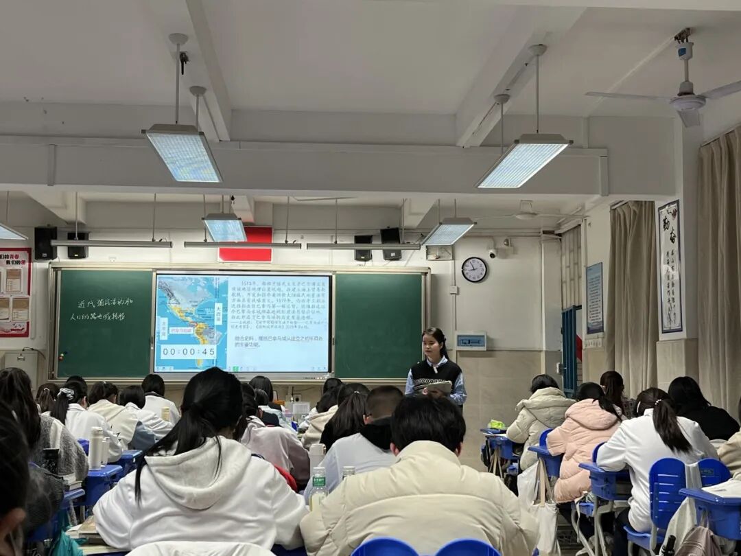 在高中部,同学们观摩了温锦芳老师《近代殖民活动和人口的跨区域转移》一课。温老师以“巴拿马城”构建教学情景,通过问题链的设计引导学生逐步深入思考近代人口的转移趋势、其与殖民活动的关系,理解“文明交流互鉴”,树立正确的历史观,充分展现了创新性高中历史课堂在知识整合和能力培养层面的重要意义。