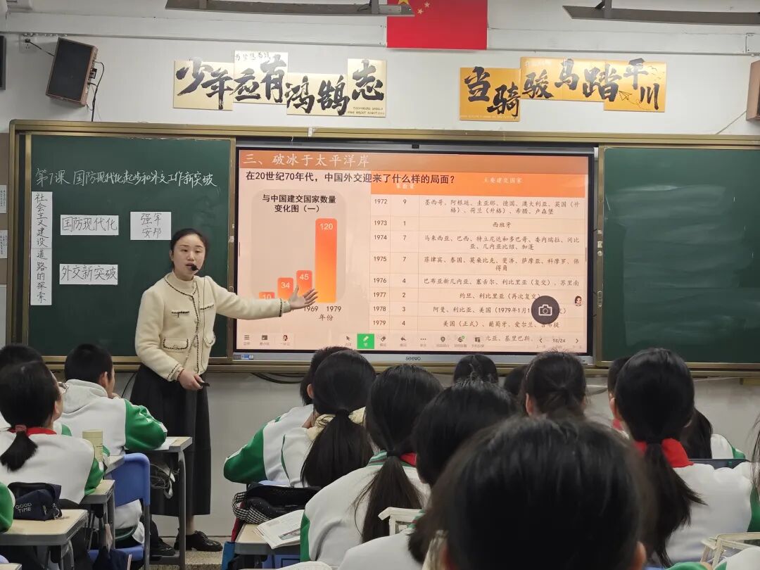 林毓莹老师讲授《国防现代化起步与外交工作新突破》一课时,从“铸盾于陆海空天”“扬旗于联合国席”“破冰于太平洋岸”三个维度,展现新中国国防与外交的历史性突破。同时,她注重运用图片、图表、史料等多种资源,引导学生分析历史情境、提炼核心观点,践行“立足史实,培育家国情怀”的教学理念。