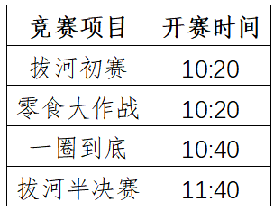 拔河比赛:各单位派一支队伍参赛,每队共15人,其中女生9人、男生6人。比赛采用一决定胜负,中途不得更换队员。通过抽签确定分组对抗,实行淘汰赛制,最终决出团队名次。