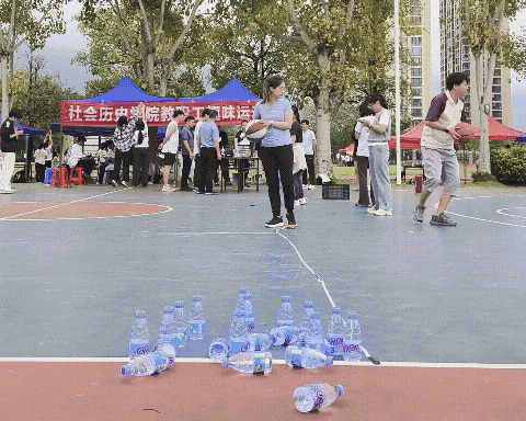 在“趣味保龄球”赛场,参赛者全神贯注,以篮球为“炮弹”,精准出击,矿泉水瓶应声倒下的脆响与阵阵欢呼交织。