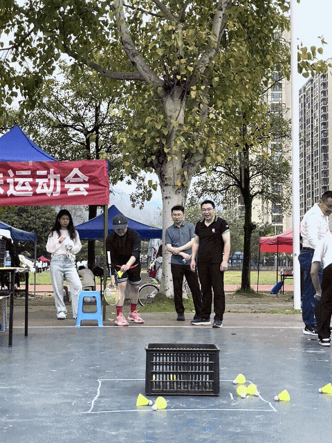 “羽毛球发球入筐”项目则是对精准发球的挑战。老师们挥拍击球,羽毛球如离弦之箭飞向数米外的塑料桶,每一次成功的“哐当”入桶,都引来一片赞叹。